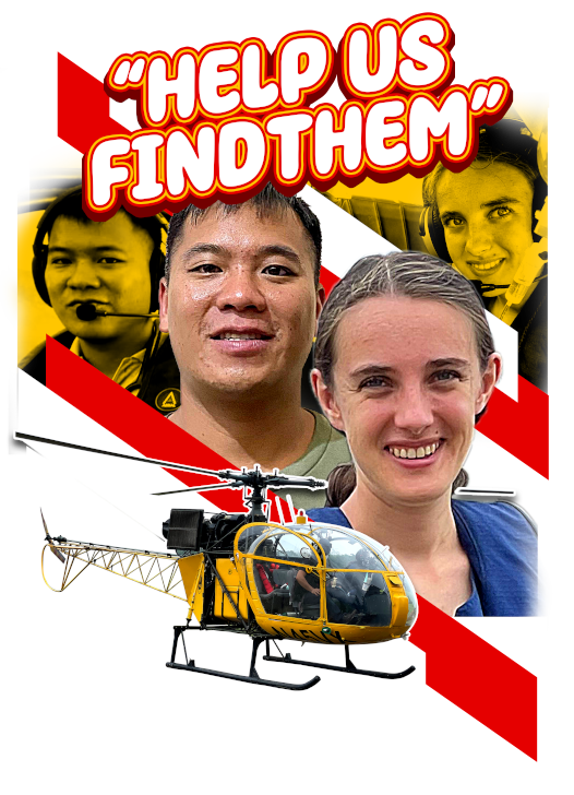 On March 1, 2023, pilot and medic Daniel Lui and nurse Janelle Alder left on a medical evacuation helicopter flight in the Southern Palawan region of the Philippines and disappeared while over the ocean. Searches so far have not yielded any conclusive evidence, and we are asking for your help to discover any information about Daniel and Janelle, the yellow helicopter, or the passengers Khayrun Nesa Sahibad, Nastru Sahibad, and Sug Hamja.